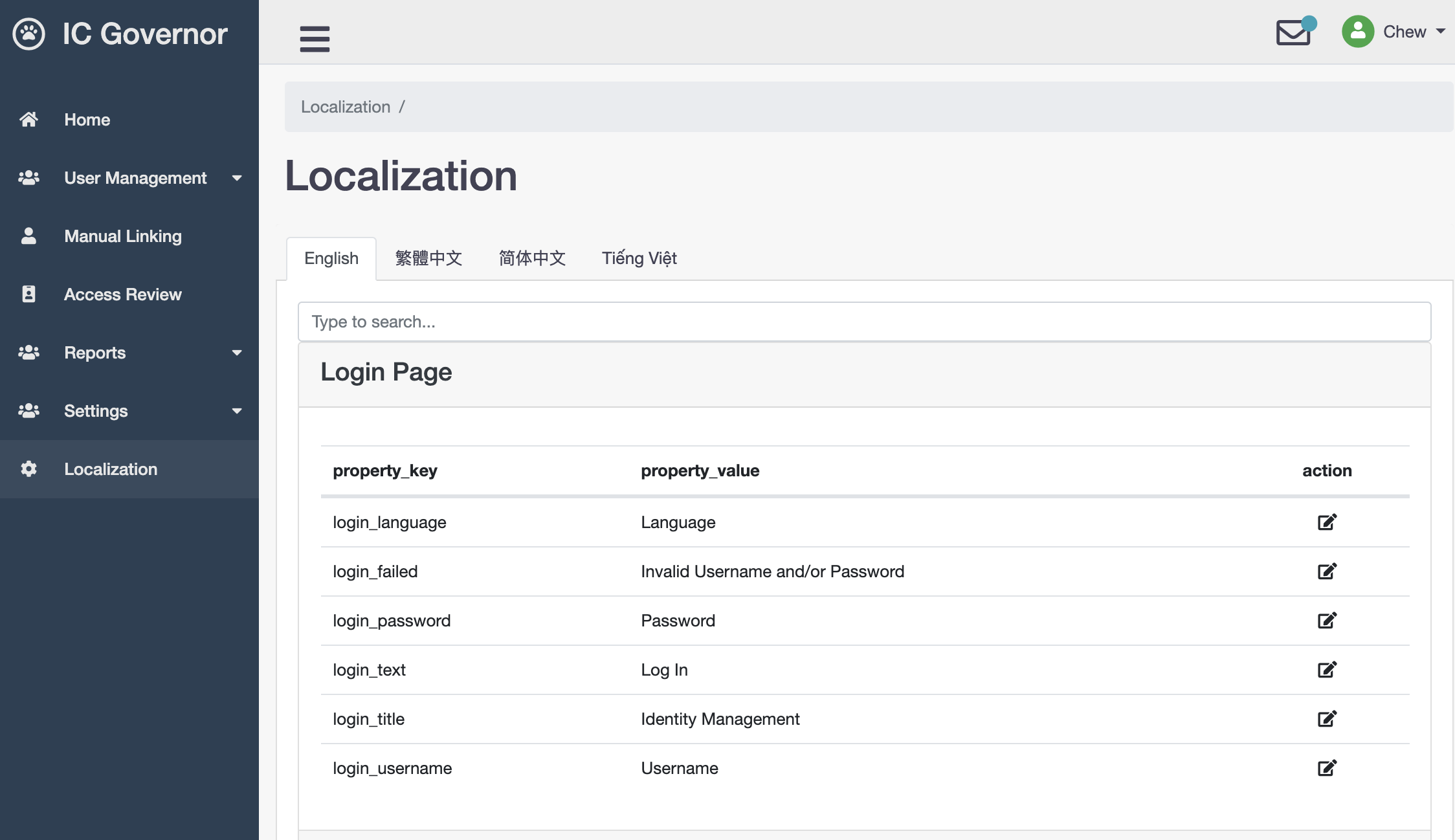 Welle offers 4 language support - English, Chinese (Traditional), Chinese (Simplified) and Vietnam. By clicking on the edit action button on each property key, the corresponding property value can be modified. Any change will be dynamically updated, thus there is no need to restart Welle.